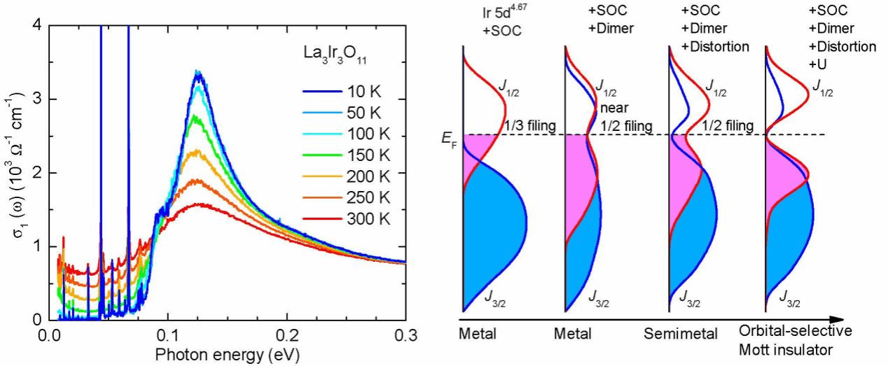 La3Ir3O11中的光学激发特征和轨道选择性Mott绝缘态的形成示意图