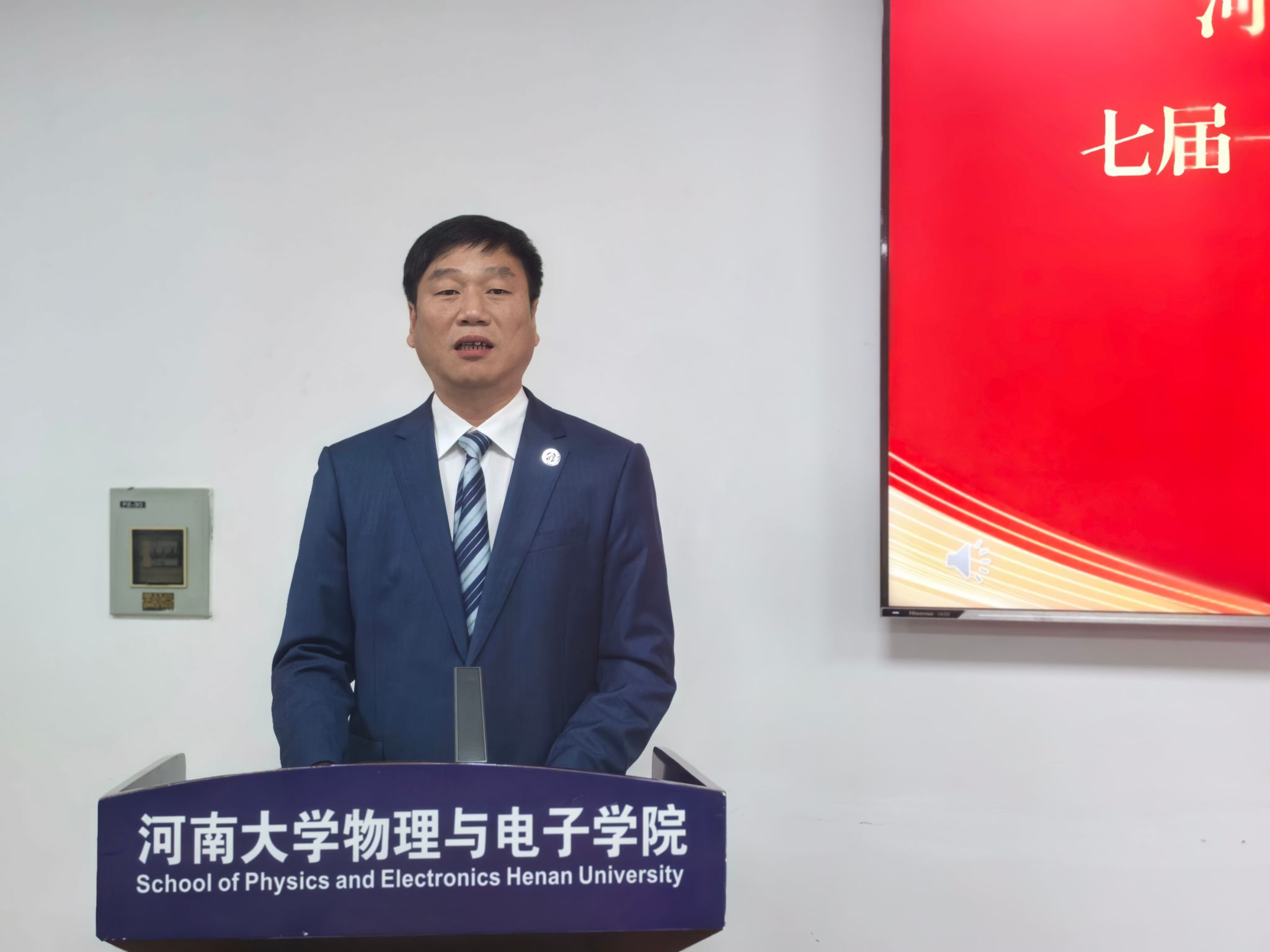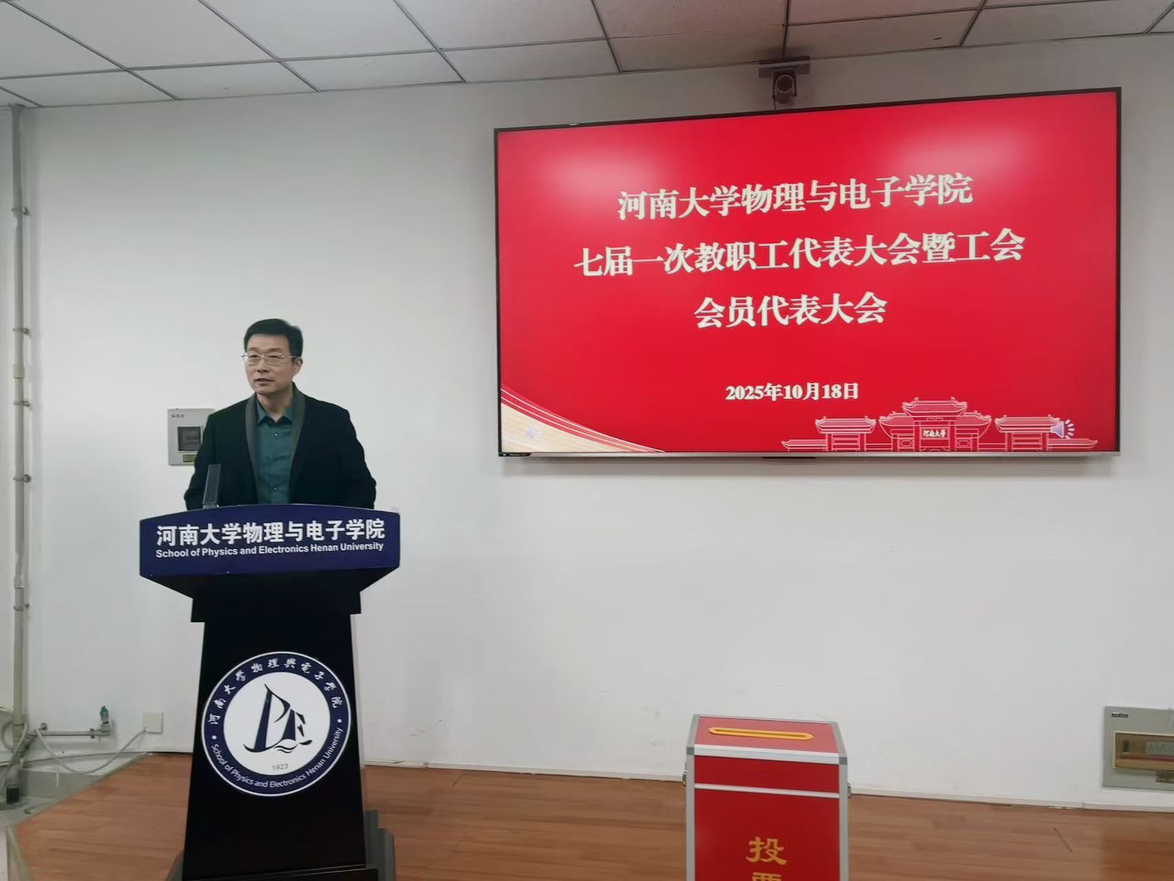 徐飞代表校工会致辞,他对大会的召开表示热烈祝贺,高度肯定了物理与电子学院近年来在各方面取得的成绩。他指出,学院在推动自身高质量发展的同时,为学校建设注入了强劲动力,希望学院以此次大会为契机,持续深化改革创新,为学校事业发展作出更大贡献。