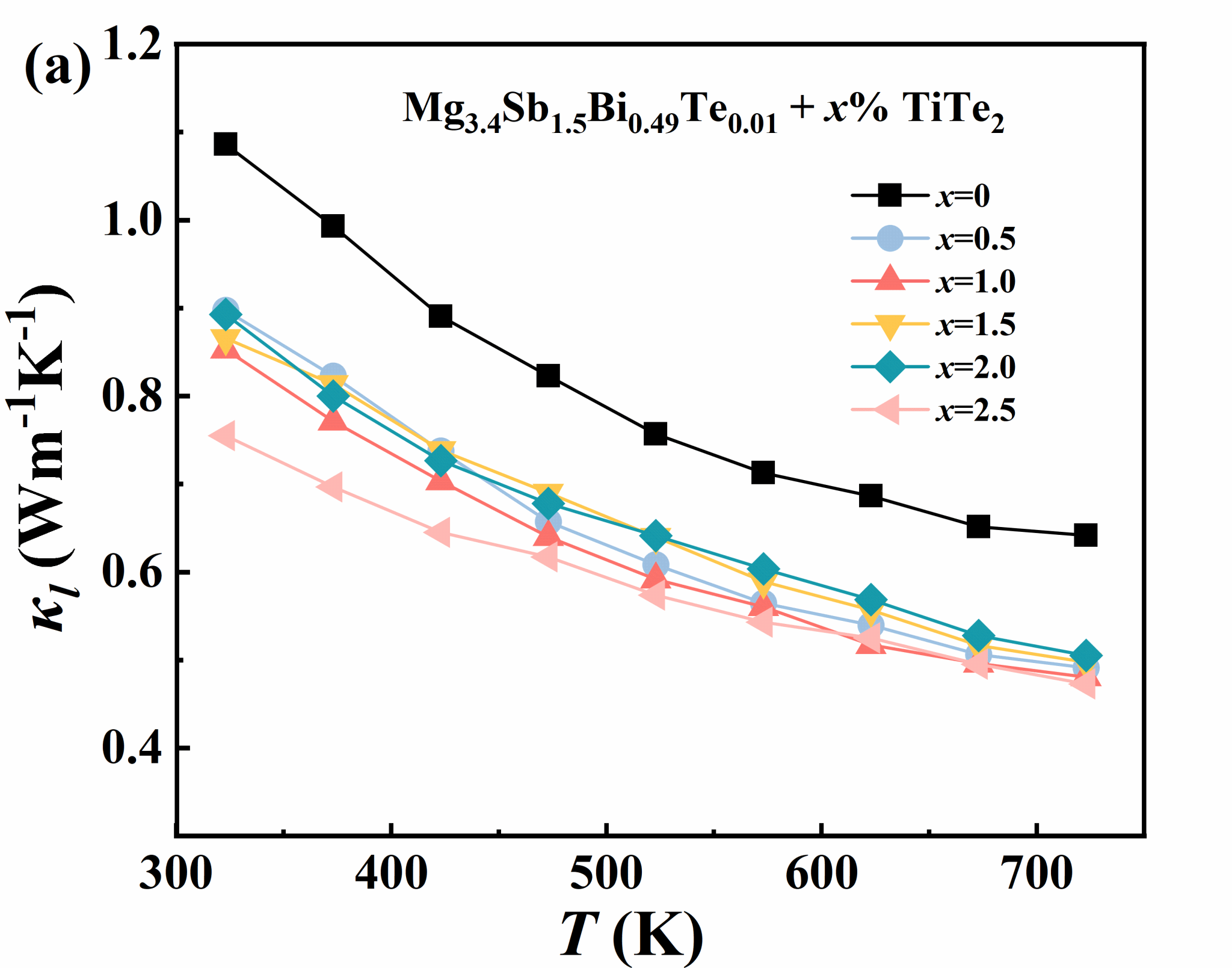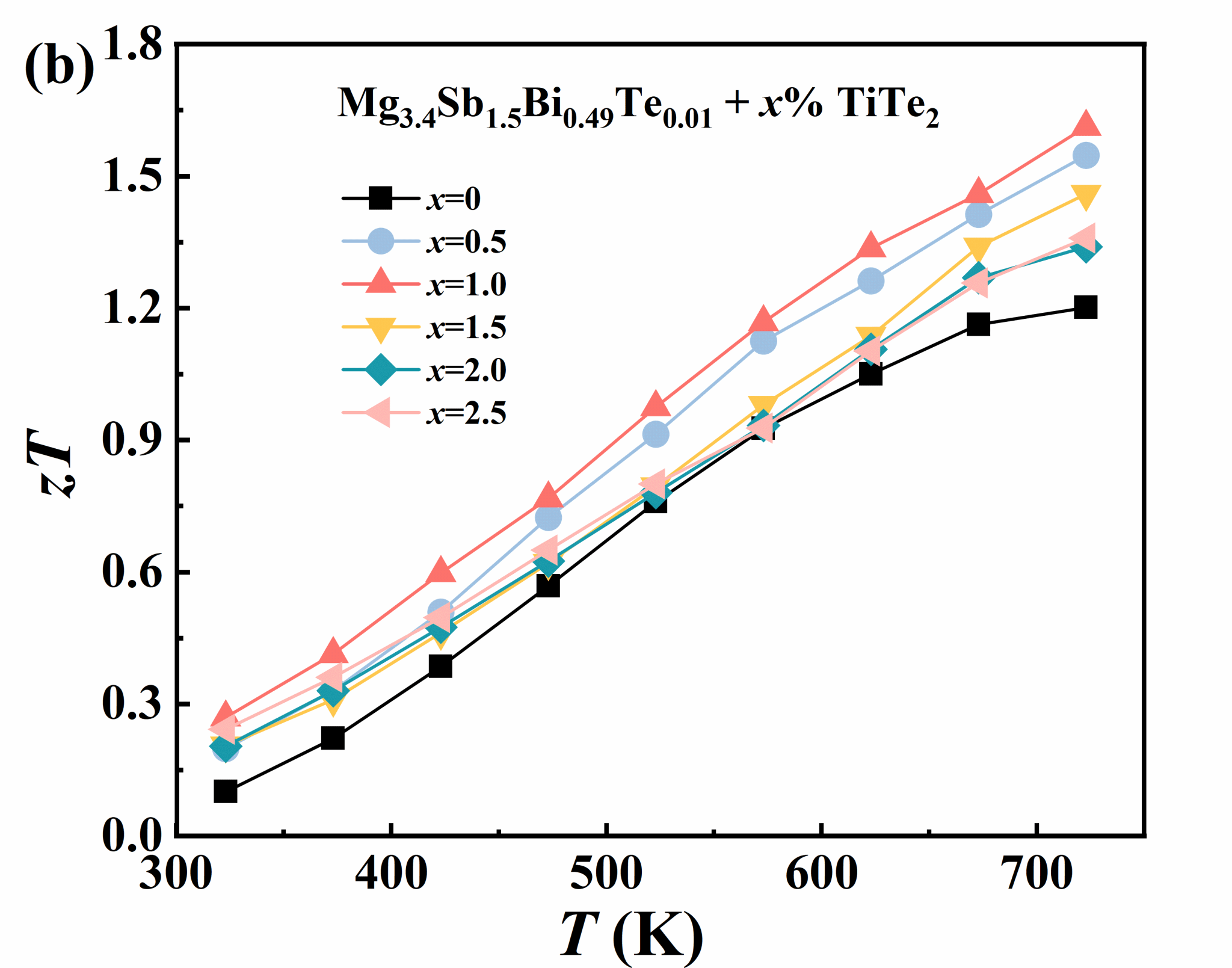 热电技术可实现热能与电能的高效转换,是推动能源结构转型与可持续发展的关键技术,热电优值 zT 是评价材料性能的核心指标。Mg3(Sb,Bi)2基热电材料因原料丰富、成本低廉、近室温性能优异备受关注,其中n型 Mg3(Sb,Bi)2具有优良的电输运特性与低热导率,研究价值显著。目前,n 型 Mg3(Sb,Bi)2的性能提升受限于载流子浓度与迁移率的耦合矛盾及较高晶格热导率,传统掺杂方法难以实现电、热输运协同优化。针对这一前沿科学问题,我院本科生科研团队勇于探索,提出 TiTe2原位双位点掺杂新策略,并深入探究了TiTe2在n型 Mg3.4Sb1.5Bi0.49Te0.01体系中的调控机制。研究表明,TiTe2在烧结过程中原位解离并实现双位掺杂,有效提高载流子浓度、优化功率因子,同时诱导产生纳米析出沉淀和位错,构建多级声子散射中心,大幅降低晶格热导率。实验结果显示,1% TiTe2掺杂样品在 723 K 时zT值可达1.61,较未掺杂样品提升34.2%,实现电、热输运性能协同增强。