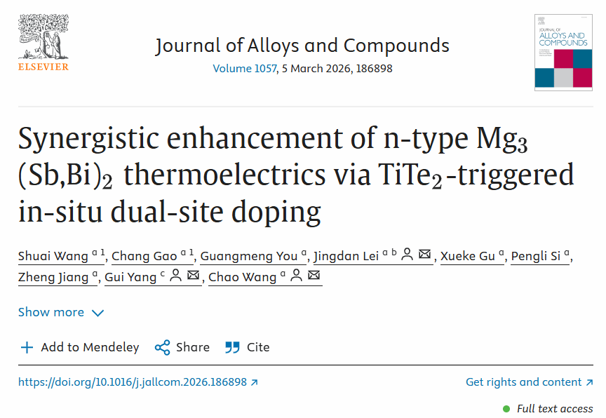 近日,国际知名期刊《Journal of Alloys and Compounds》在线刊发了我院本科生的最新科研成果。2023级本科生王帅、高畅作为共同第一作者,在导师王超教授悉心指导下,完成了题为“Synergistic enhancement of n-type Mg3(Sb,Bi)2 thermoelectrics via TiTe2-triggered in-situ dual-site doping”的研究论文,充分彰显了学院扎实的科研积淀与拔尖创新人才培养的显著成效。