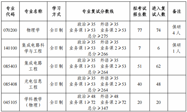 在国家分数线基础上,结合我院招生具体情况,划定2026年(物理学、集成电路科学与工程)学术型硕士研究生以及(集成电路工程、光电信息工程、学科教学(物理))专业型硕士研究生的复试分数线,具体如下表所示。