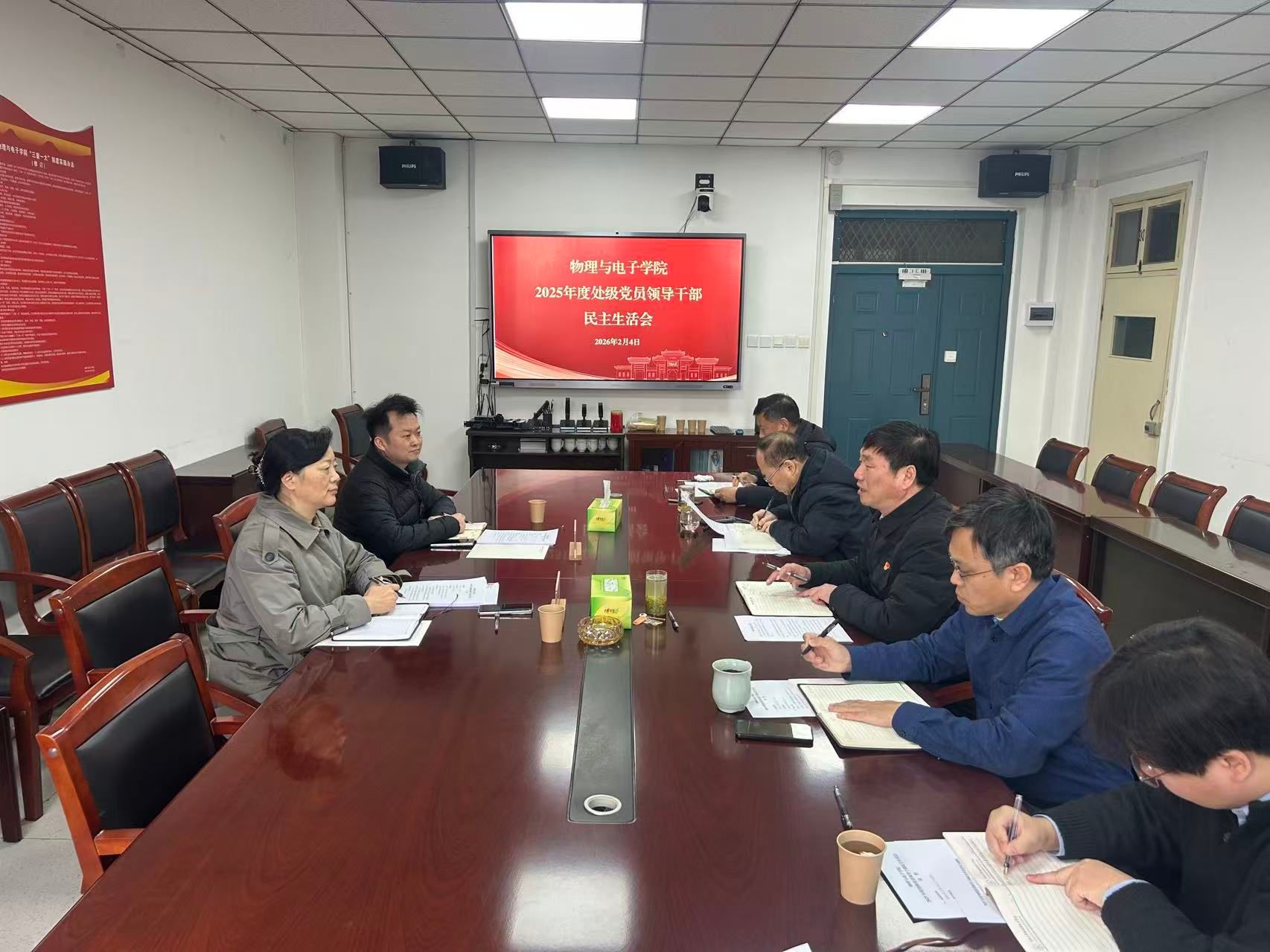 2月4日,物理与电子学院在学院A楼311会议室召开2025年度处级党员领导干部民主生活会。学校第一督导组组长、校纪委副书记宋菊芳,督导组成员、宣传部办公室主任刘旭阳到会指导。学院全体处级领导干部参加会议。会议由学院党委书记张慧主持。