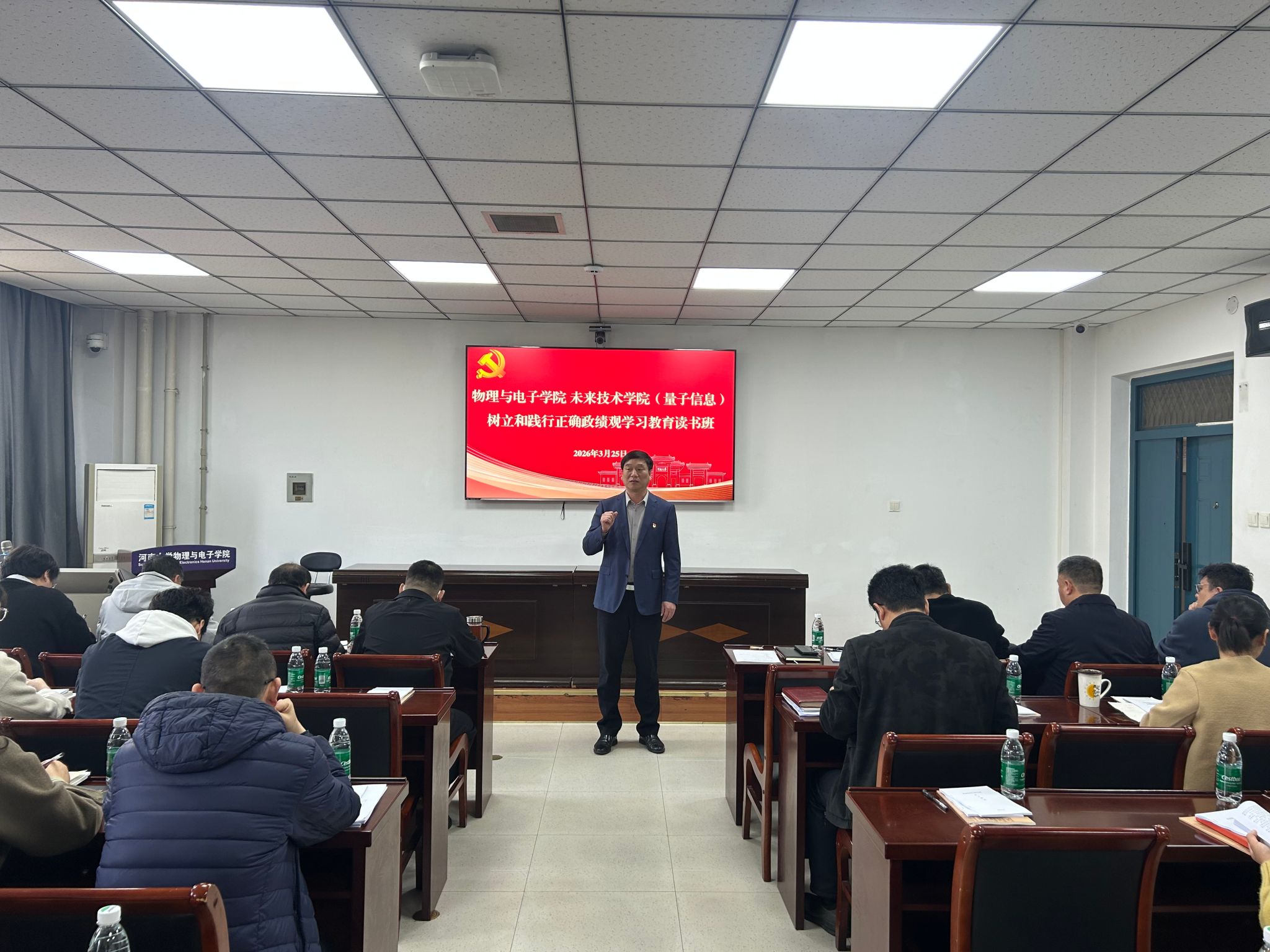按照开展树立和践行正确政绩观学习教育工作安排,3月25日至26日,物理与电子学院、未来技术学院(量子信息)采取领读领学、专题党课、集中自学和交流研讨等相结合的方式,联合举办树立和践行正确政绩观学习教育读书班。学院党委委员、班子成员、组织员、党支部书记、系室主任及党员代表参加。学院党委书记张慧主持并作专题党课辅导。